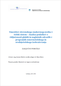 V poročilu s podnaslovom Analiza podatkov o vključenosti gluhih in naglušnih odraslih v programih osnovnošolskega in srednješolskega izobraževanja so predstavljene ugotovitve o udeležbi gluhih in naglušnih odraslih v programih formalnega izobraževanja. Avtorici, Jasmina Mirčeva in Mirna Macur, sta si prizadevali odgovoriti na vprašanja, povezana s stopnjo udeležbe gluhih odraslih v programih osnovnošolskega in srednješolskega izobraževanja.